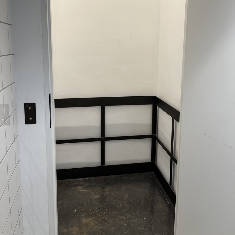 Vi har leveret en vareelevator, som er lavet i samme smukke stil som bygningen. Vareelevatoren har en platform i bruneret messing, og den betjenes ved hjælp af messingtryk. Den bruges til at fragte mad mellem